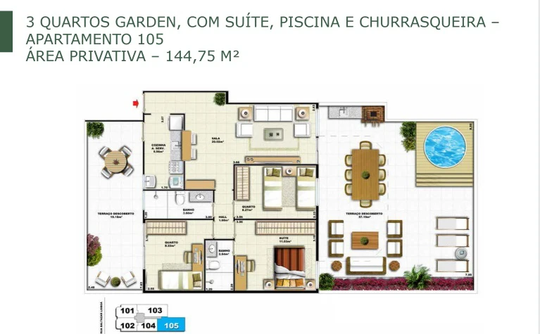 Apartamentos de 3 quartos Garden, com 100m² até 144m²